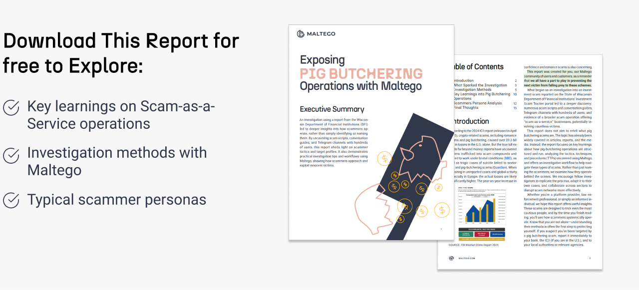 This report does not aim to retell what pig butchering scams are. The topic has already been widely covered in articles, reports, and the media. Instead, the report analyzes the tactics, techniques, and procedures (TTPs) revealed through Maltego and provides clear investigative tips and workflow for these scams. Rather than just naming the scammers, we examine how they operate so investigators can reproduce the process, adapt it to their cases, and work across sectors to better disrupt scam networks. Get the report for free below, no sign-up needed.