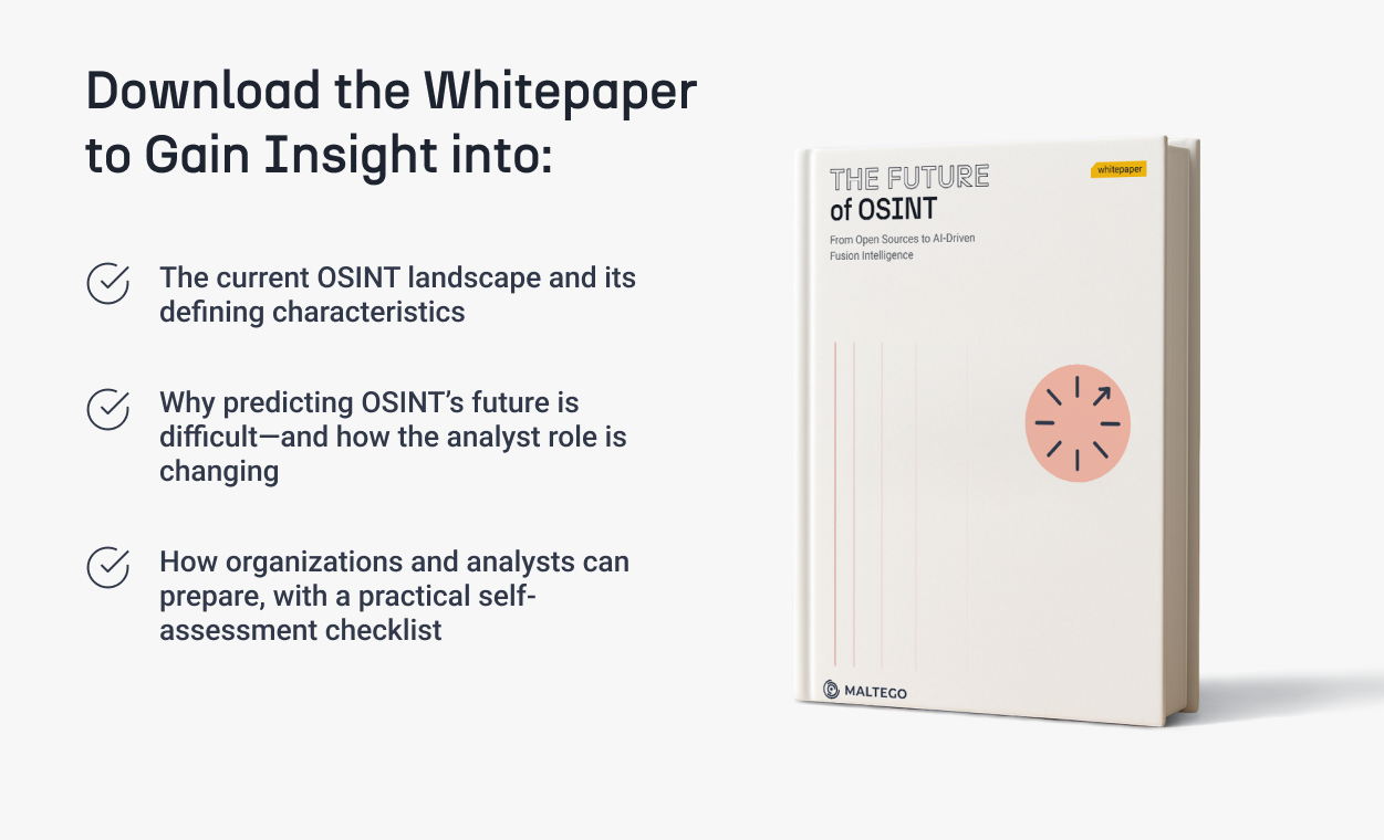 The whitepaper examines the shifts of OSINT, how these changes are shaping analysts today and in the years ahead, and why they demand not just awareness, but concrete preparation and a clear understanding of where analysts add value, supported by a self-assessment checklist to help organizations evaluate their readiness. OSINT practitioners who understand what is changing and why it matters now will be better positioned to stay ahead of emerging challenges and innovations.
