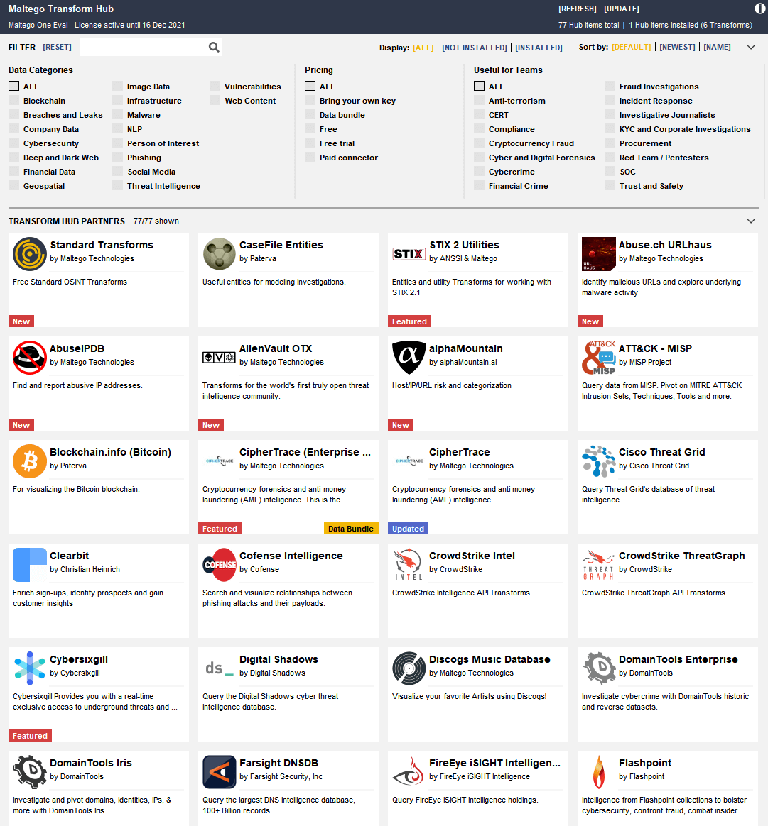 - Access over 58 data sources in the Maltego Transform Hub